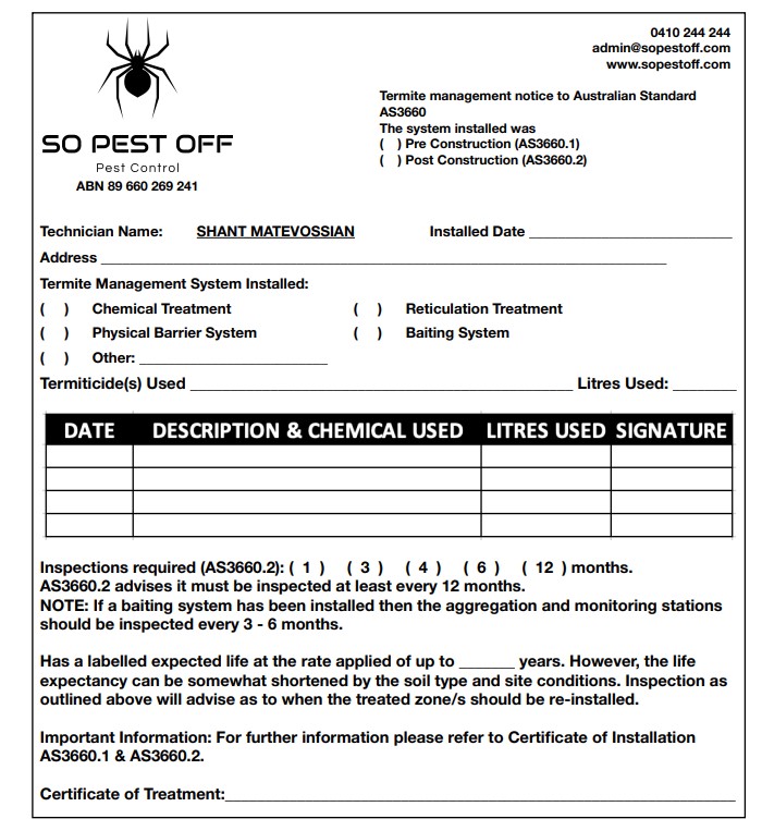 - A certificate that details the installed termite management system